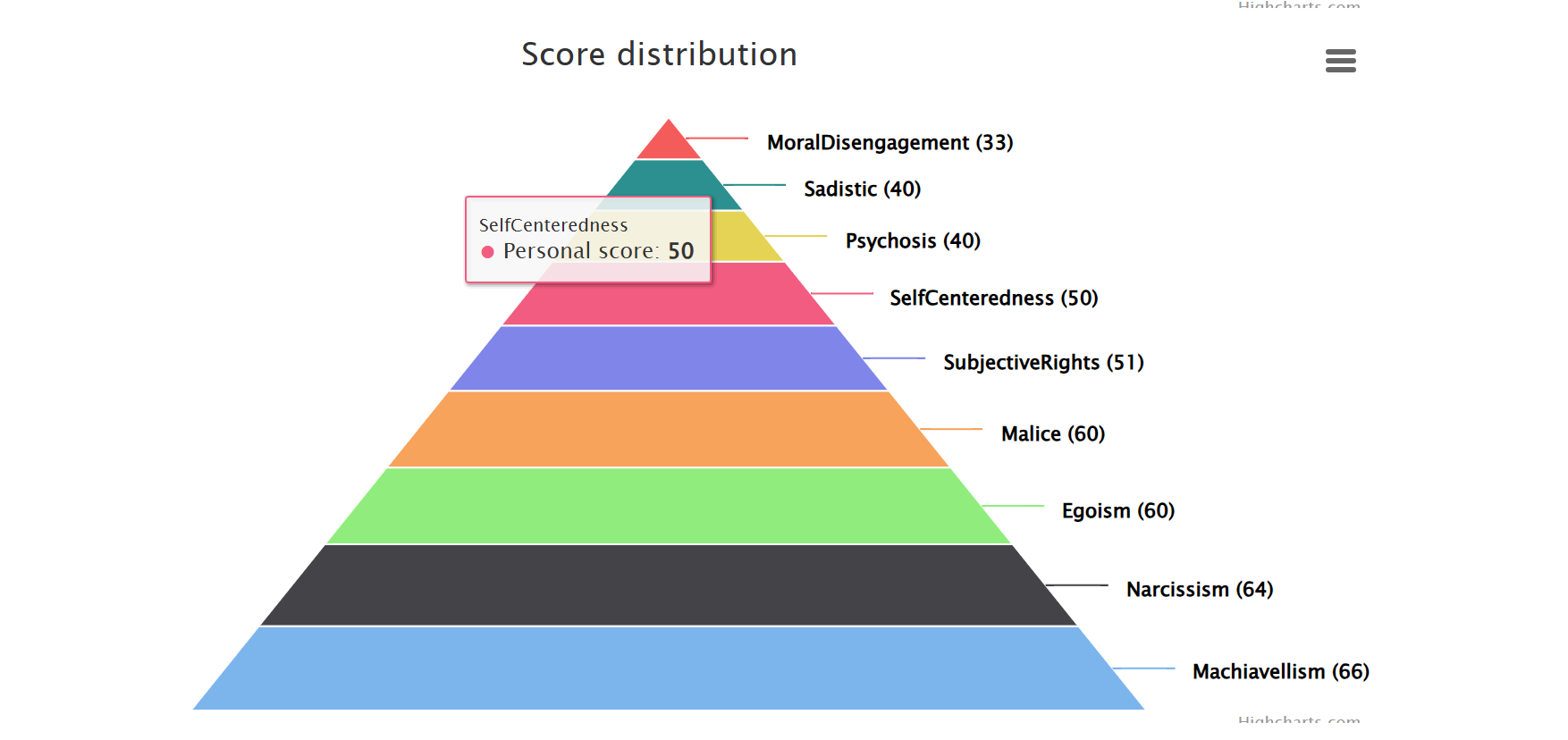 這份測試旨在評估九種相互關聯的「黑暗核心人格」特質,它們通常被認為是具有一定反社會傾向的核心要素。