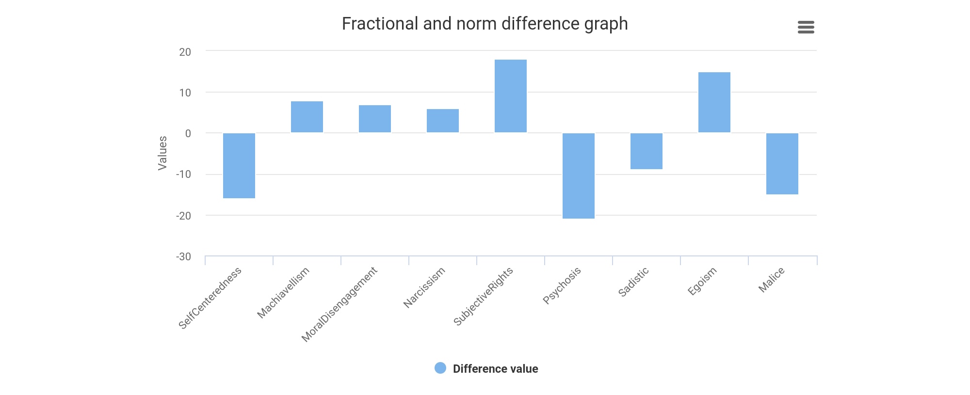 這部分揭示哪些面向您與「常模」差距最大,主要依據您提供的第三張圖表「Fractional and norm difference graph」。
