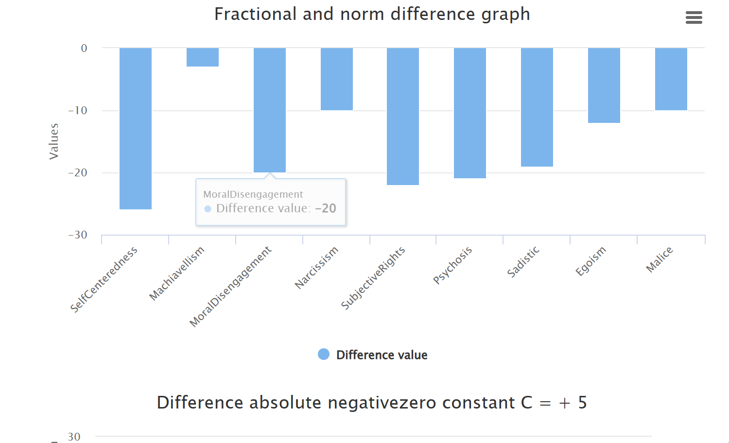 特別說明: 在「自我中心」這一項上,儘管第二張圖顯示您的分數為60,而第一張圖的平均分數也約為60,但第三張圖「Fractional and norm difference graph」中「自我中心」的差異值卻顯示為-15。這暗示了數據源可能存在一些微小差異,但我將優先根據各圖表的明確標示來匯總信息。