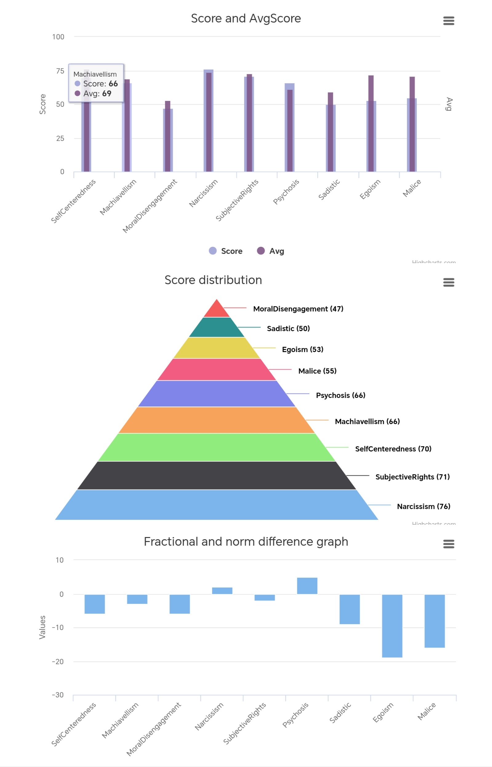 - 中等:Machiavellism (66), Psychosis (66)
