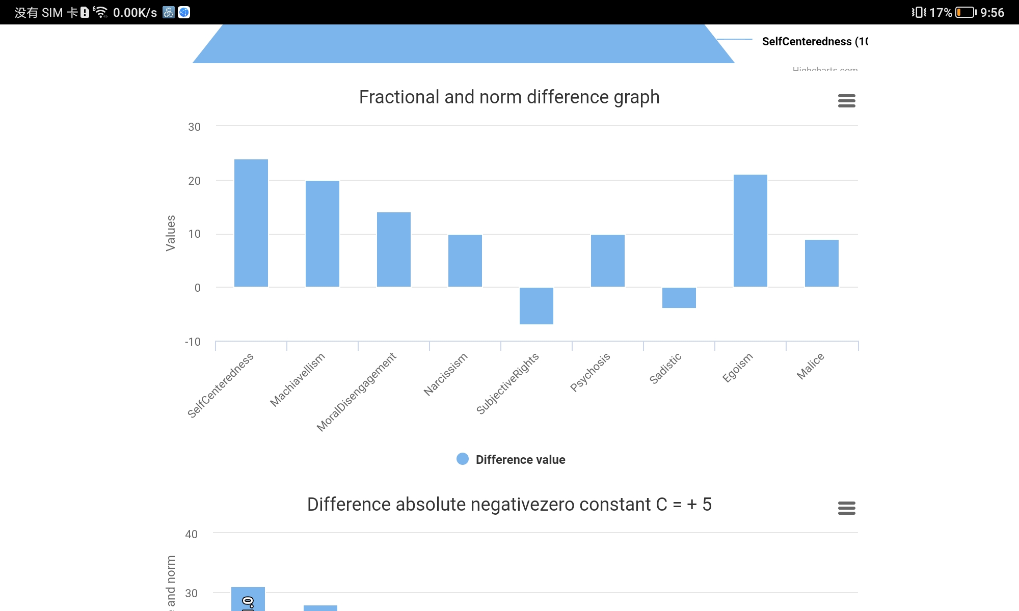 - 註:馬基雅維利主義與第一部分計算的+16有微小差異;利己主義與第一部分計算的+8有較大差異,此圖表顯示您的利己主義傾向極高於常模。