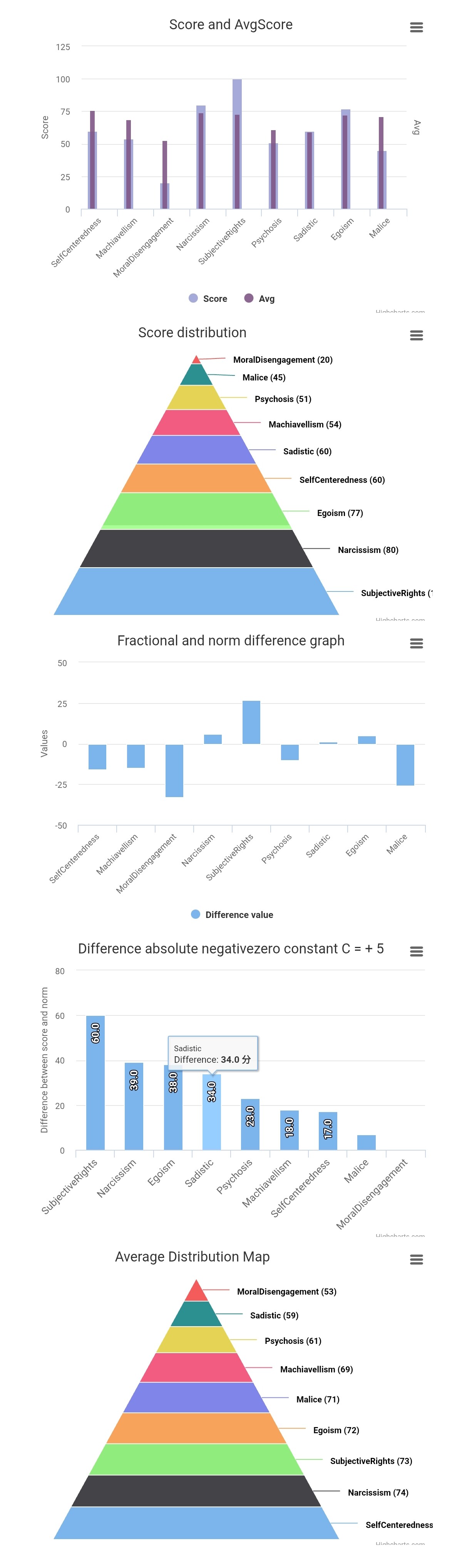 总体来说就是: 你在“自我中心”、“玩心计”、“只顾自己”、“给自己开脱”、“自恋”、“冷漠”、“想让人不爽”这些方面,都比绝大多数人要突出得多。只有“觉得自己什么都该得”和“从别人痛苦中找乐子”这俩没那么高。