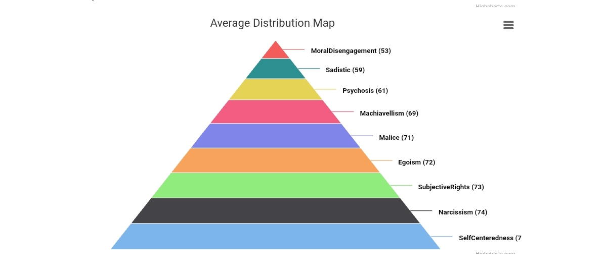 核心特點:您在「施虐」和「道德脫離」方面得分最低,在「惡意」、「精神變態」、「馬基雅維利主義」和「自我中心」等絕大多數「黑暗核心人格」特質上,得分均偏低於平均水平。僅「自戀」分數略高於平均。這表明您的黑暗特質傾向整體偏低。