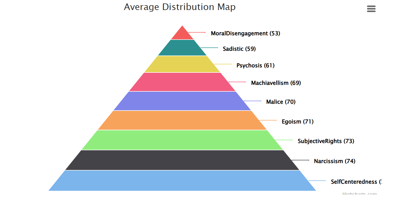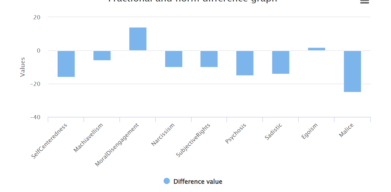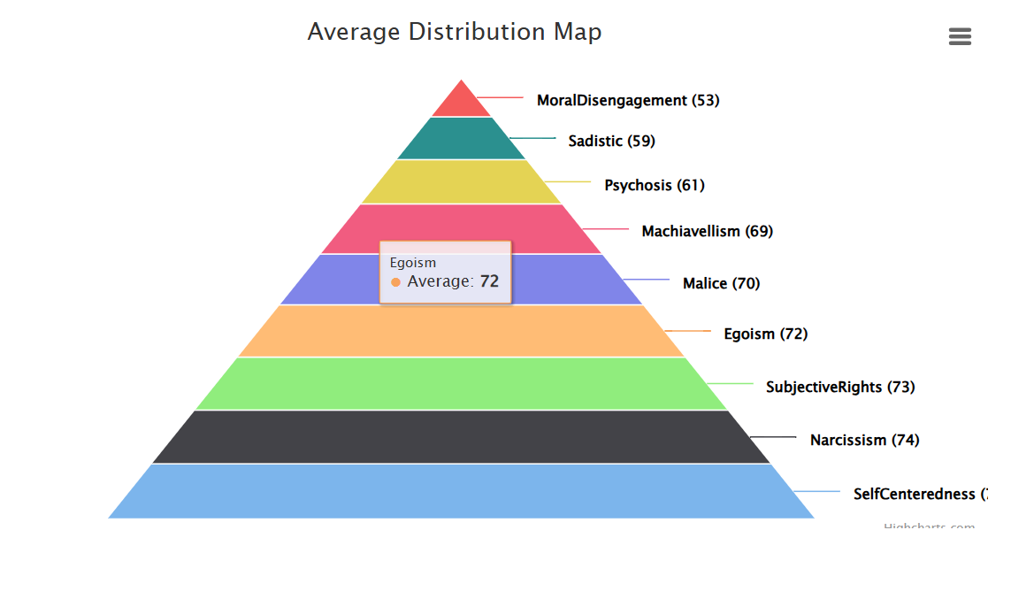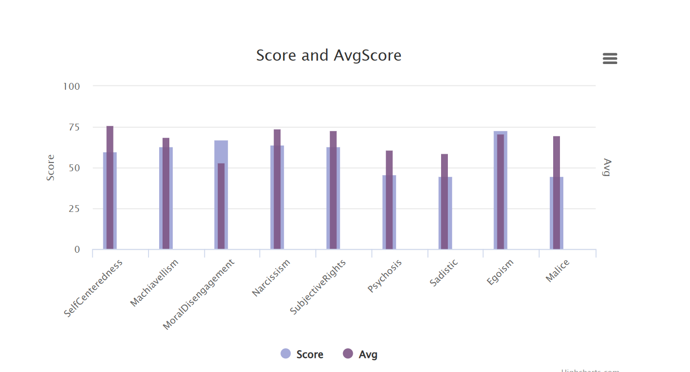 - 您在「自我中心」、「道德脫離」、「馬基雅維利主義」和「惡意」方面顯著高於常模。這表明您傾向於優先考慮自身需求、容易為不道德行為找藉口、運用策略甚至操控他人來達成目標,並可能對他人懷有負面意圖。