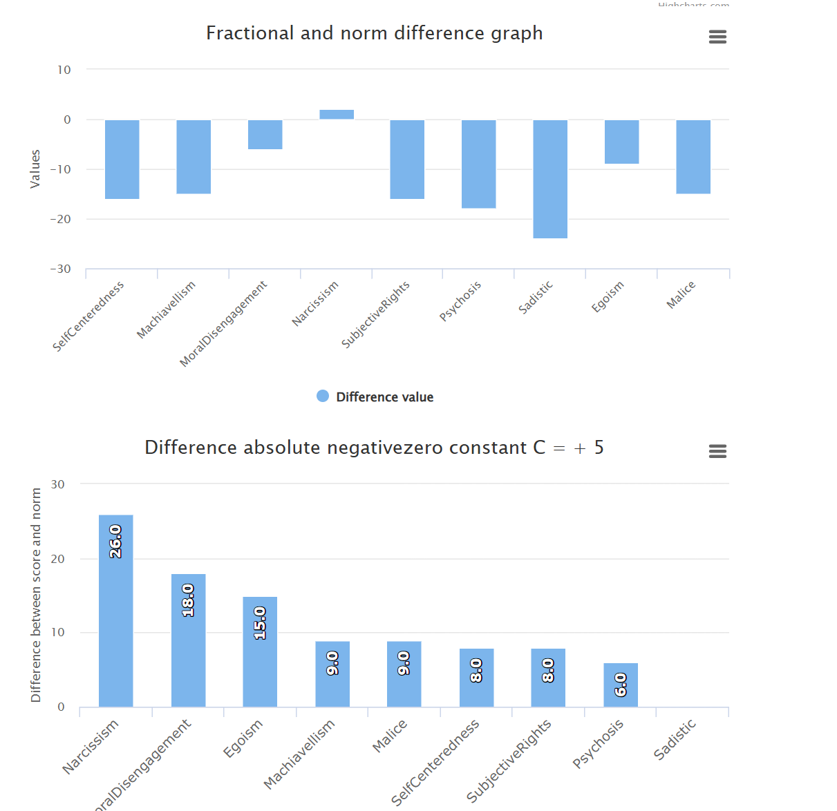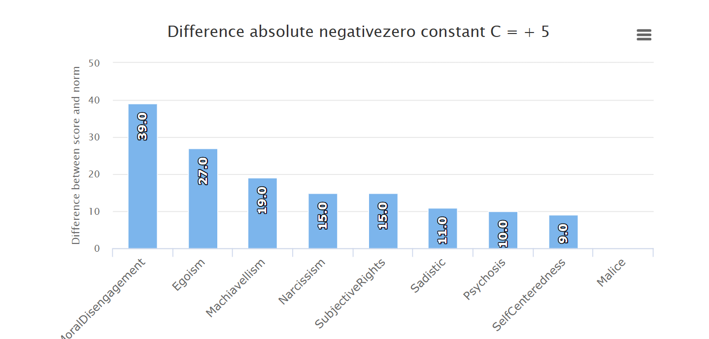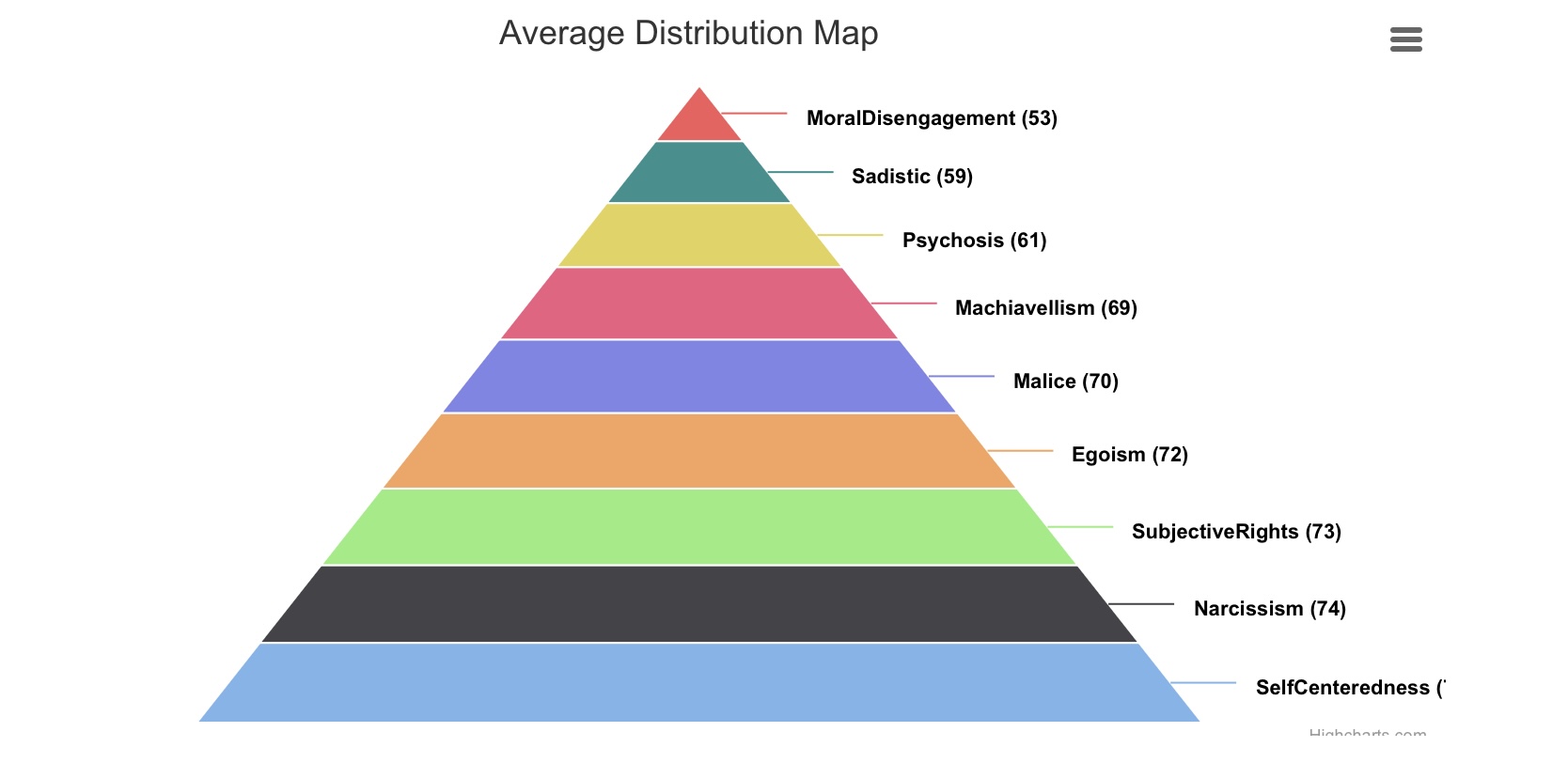 - 您在「自我中心」、「道德脫離」、「馬基雅維利主義」和「惡意」方面顯著高於常模。這表明您傾向於優先考慮自身需求、容易為不道德行為找藉口、運用策略甚至操控他人來達成目標,並可能對他人懷有負面意圖。