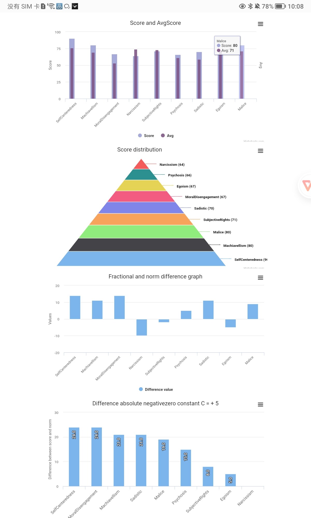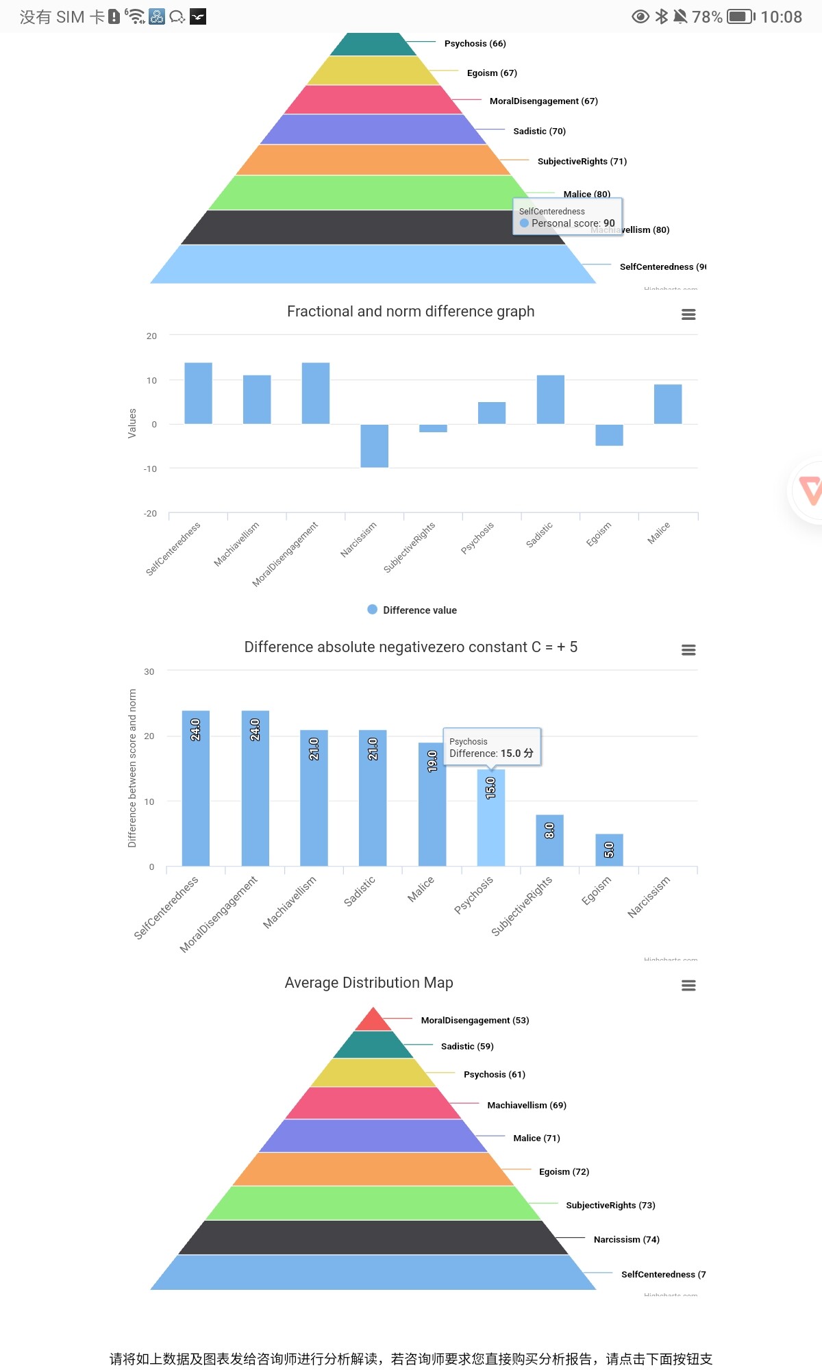 - 您在“施虐”和“自我中心”方面也显著高于常模。这表明您可能更容易从他人痛苦中获得愉悦,或在思考问题和做决策时,倾向于优先考虑自己的需求和利益。