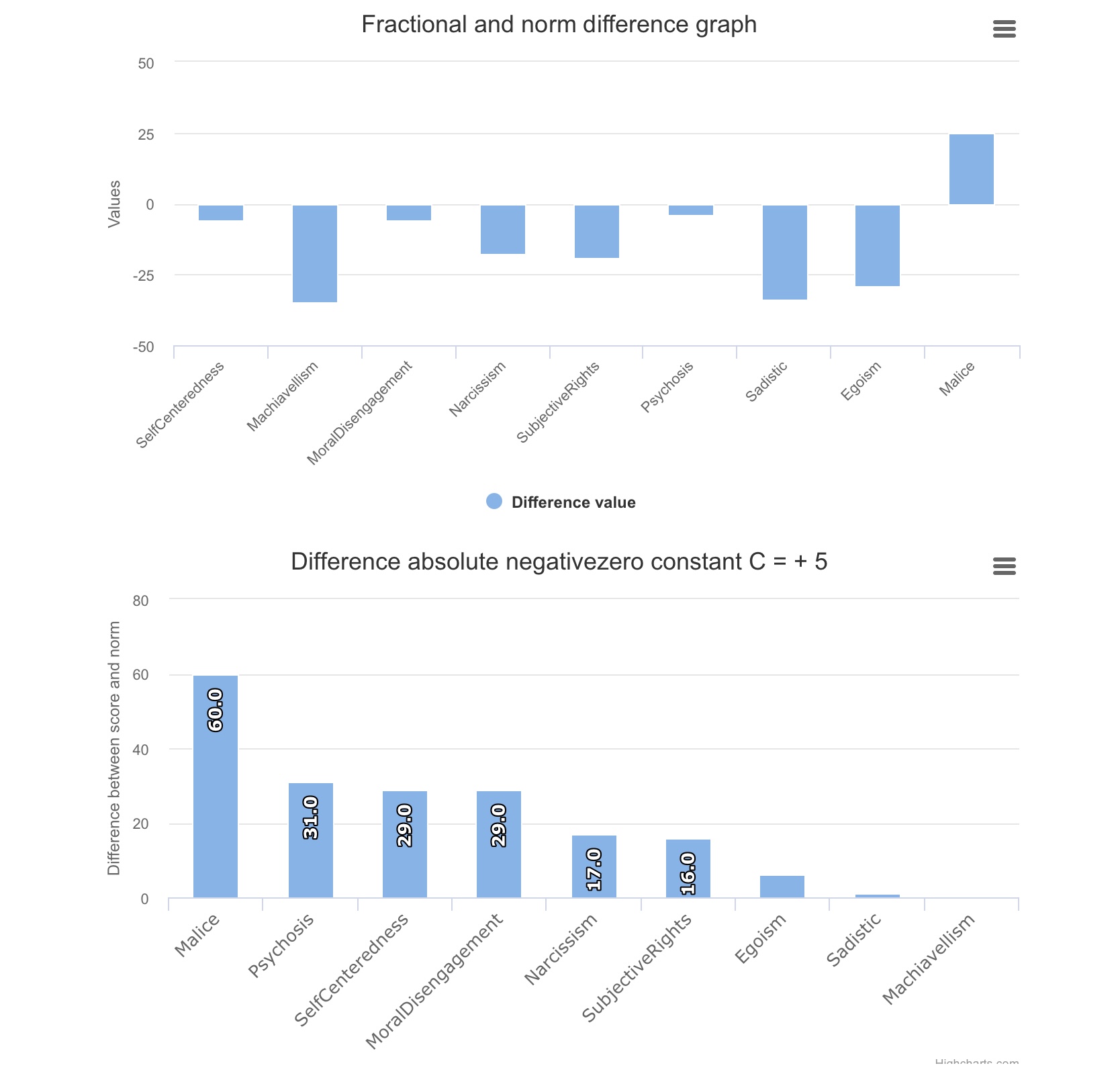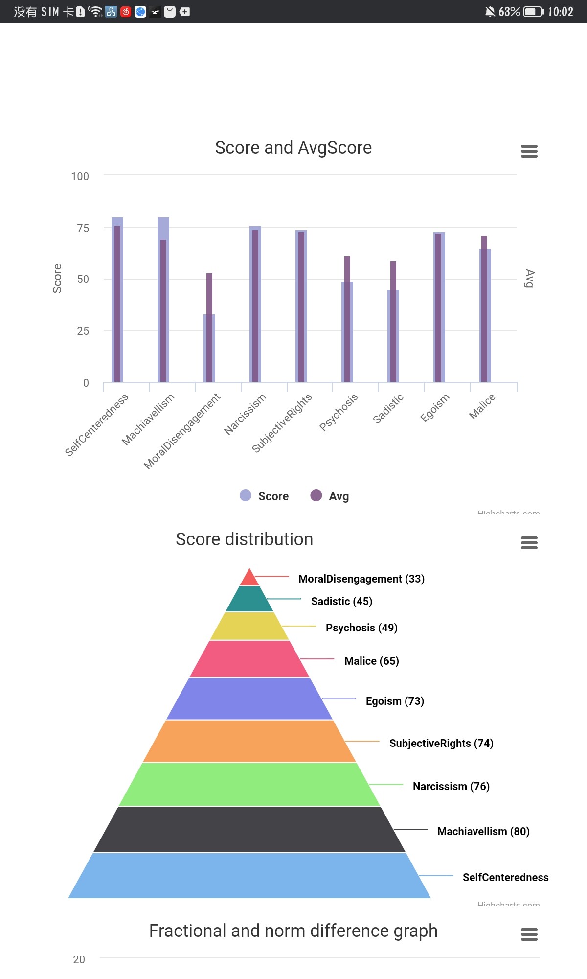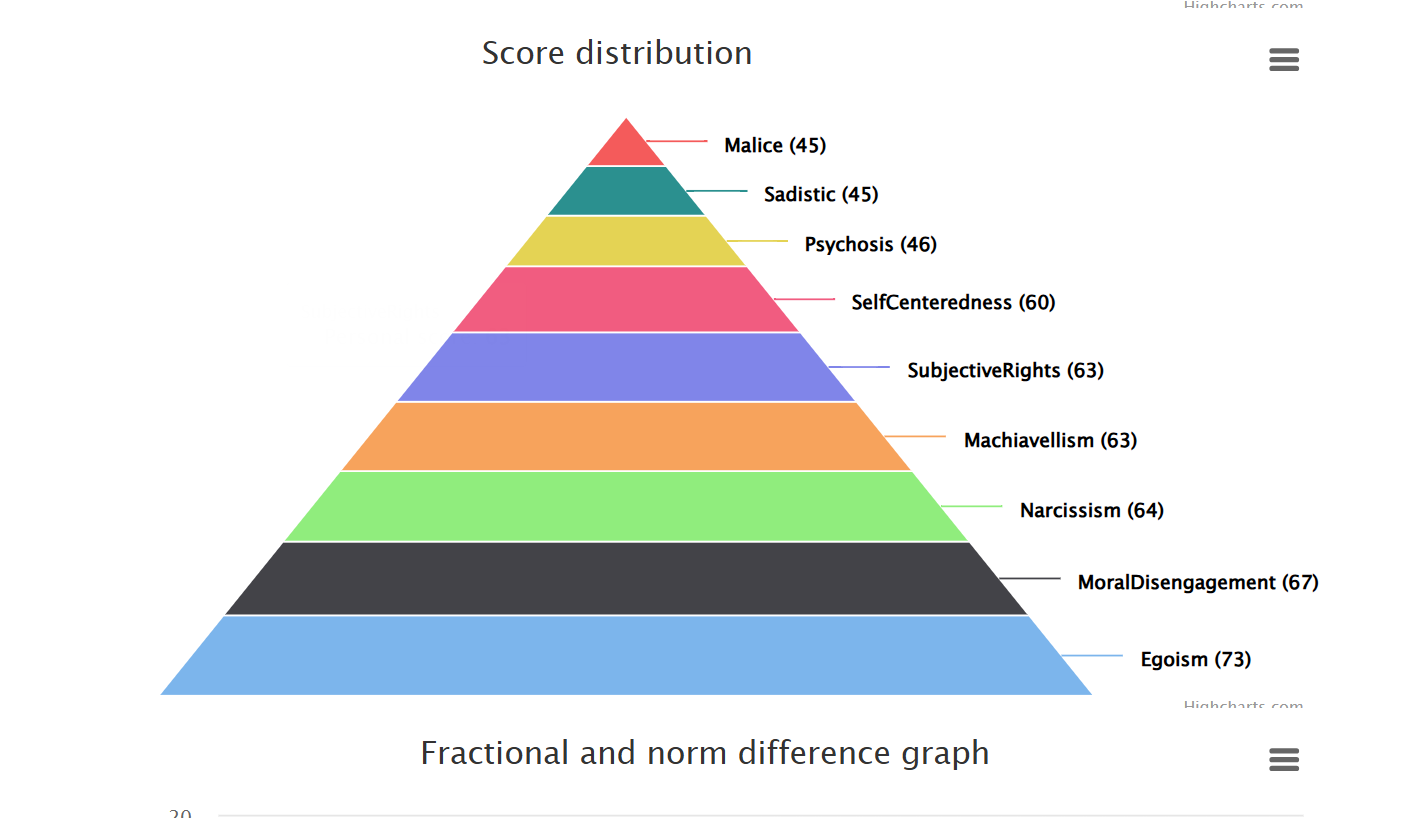 - 您在「自我中心」、「精神變態」、「施虐」、「自戀」、「主觀權利感」和「馬基雅維利主義」方面也普遍偏低於常模,這表示您不傾向於過度關注自身、缺乏共情、從他人痛苦中獲取愉悅、過度自戀、認為自己理所當然應得更多,或操控他人。
