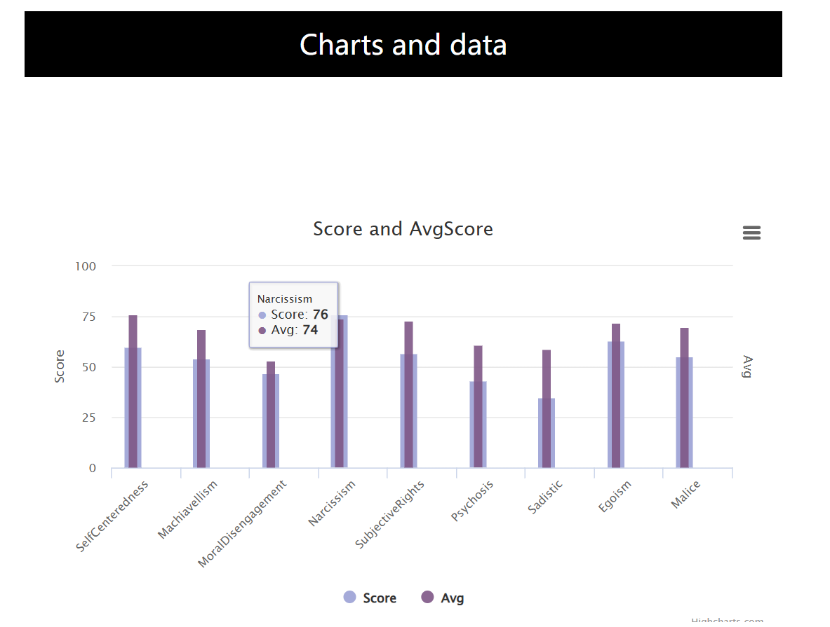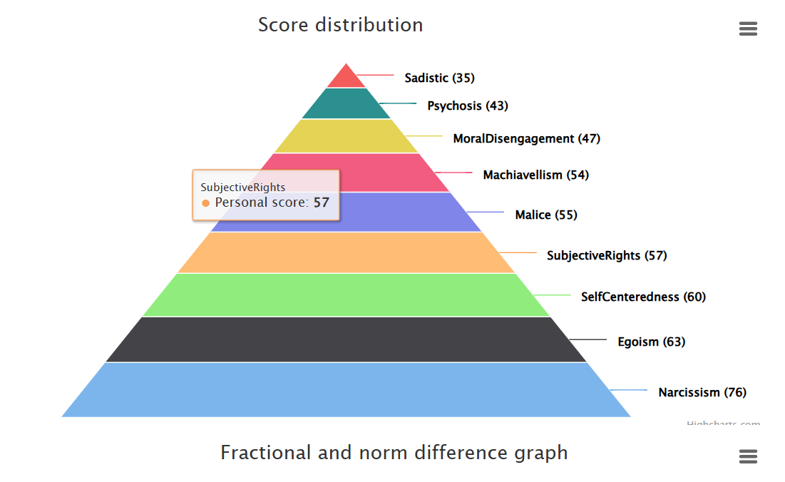 - 與此形成鮮明對比的是,您在「馬基雅維利主義」、「施虐」和「利己主義」方面得分極顯著或顯著低於常模。這意味著您不傾向於操控他人、從他人痛苦中獲得愉悅,也不會極度將個人利益置於一切之上。
