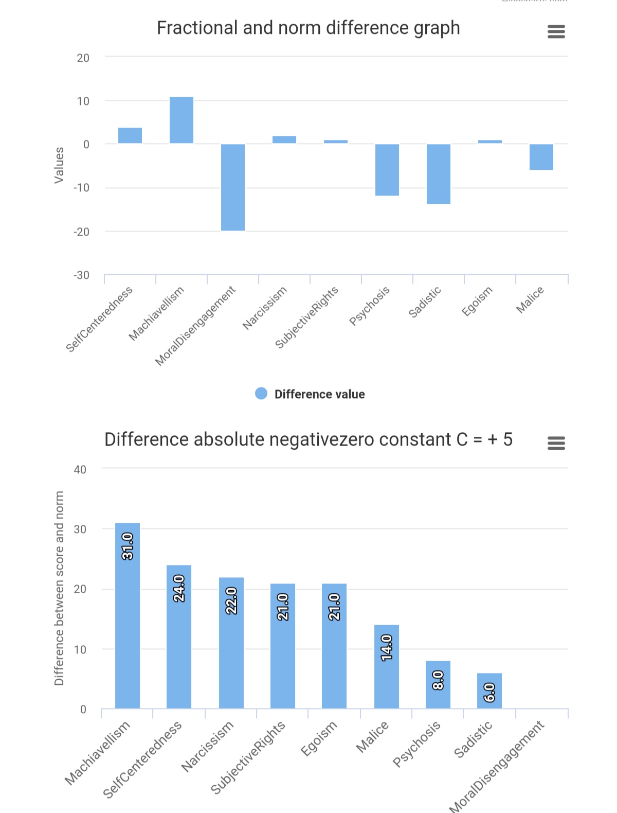 - 註:馬基雅維利主義的計算差異為+11,惡意的計算差異為+9,圖示均為+10。