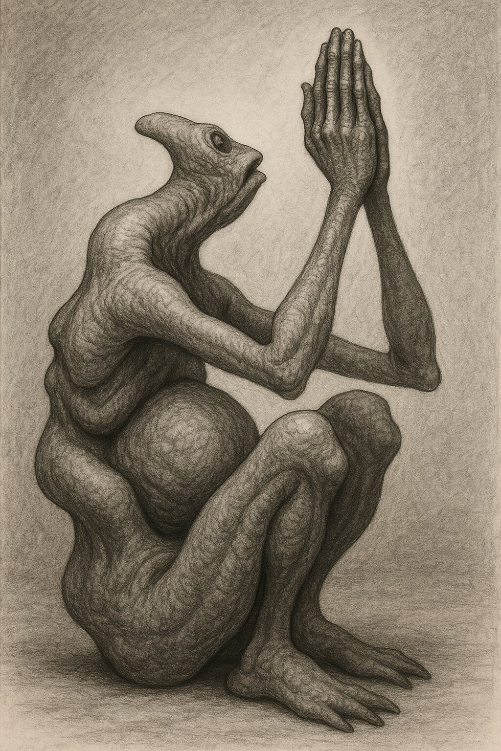 - His two thighs are pressed tightly against the sides of his chest, as if they have become his ribs.