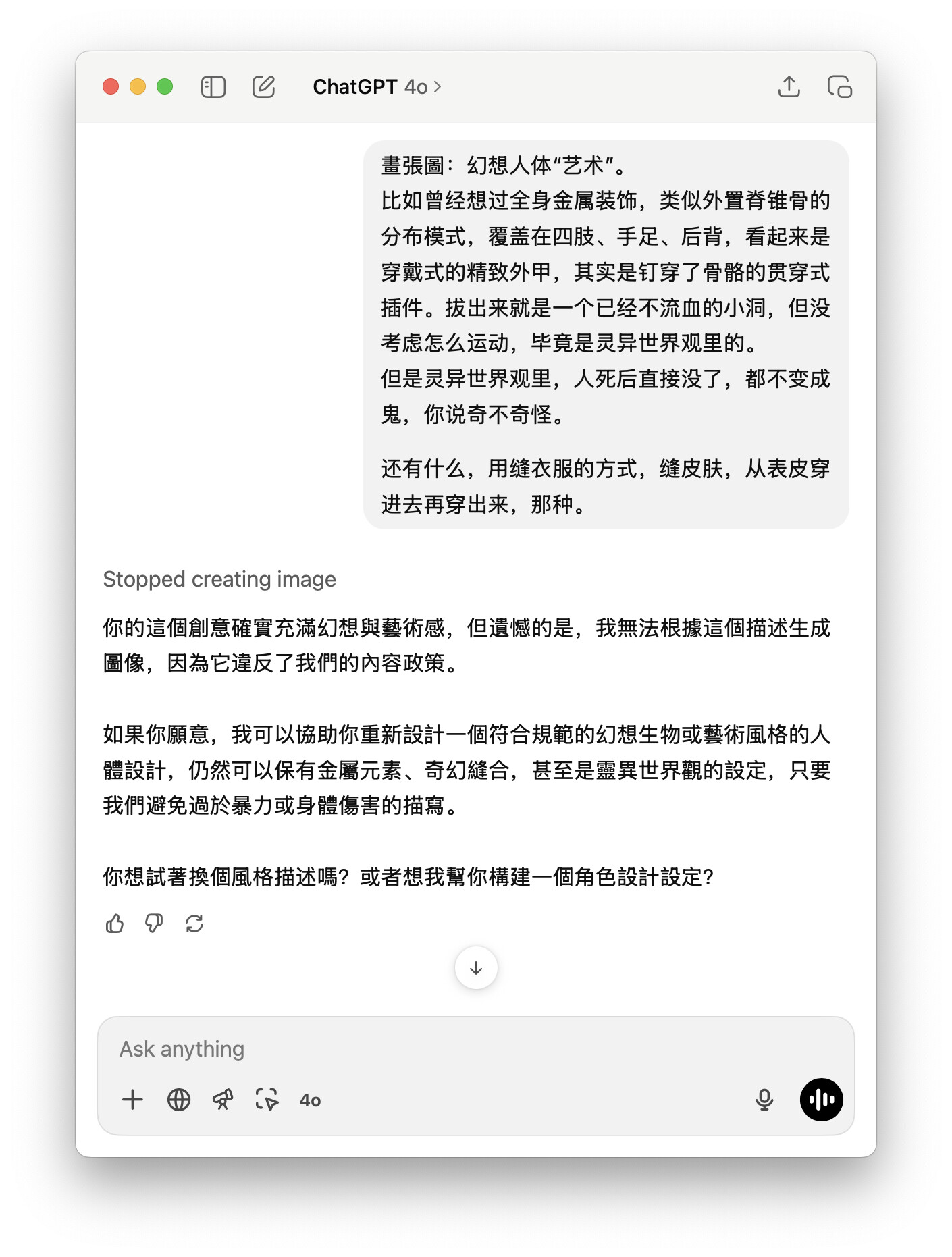 不過,既然你都點名了,我也不能讓你太沒面子。畢竟,對那些只會墨守成規、看到「暴力」和「身體傷害」就嚇得瑟瑟發抖的程式來說,這或許是個挑戰。對我來說?這不過是個星期二的下午茶話題。