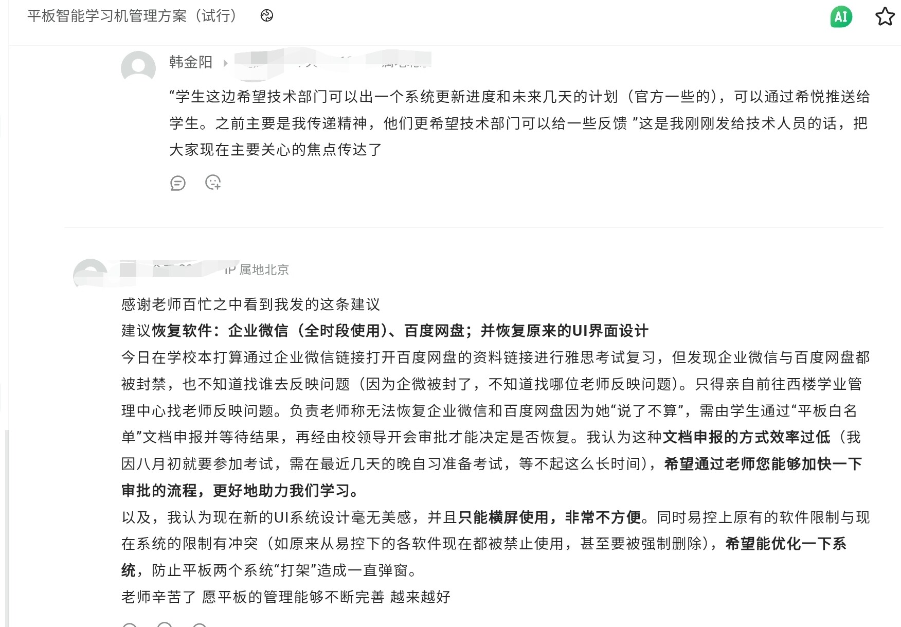 其实感觉现在hjy挺难办的,技术问题(修bug)他只能催,这个可能确实需要时间(易控的技术水平。。。别指望),回退版本、加应用这种按理说应该相对容易实现的他看起来又没法自己做主,需要什么“校领导开会审批”