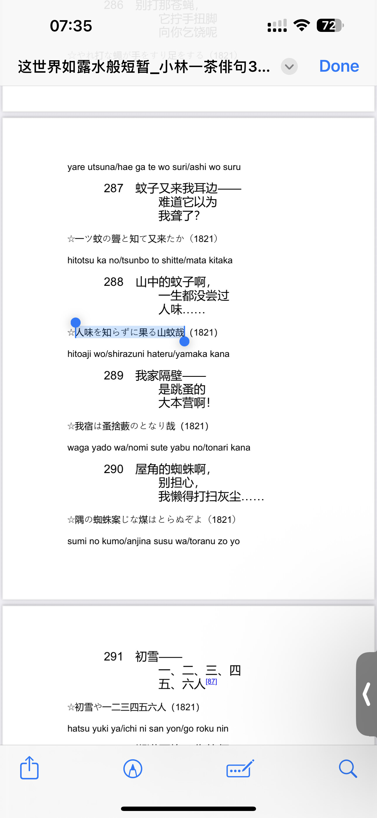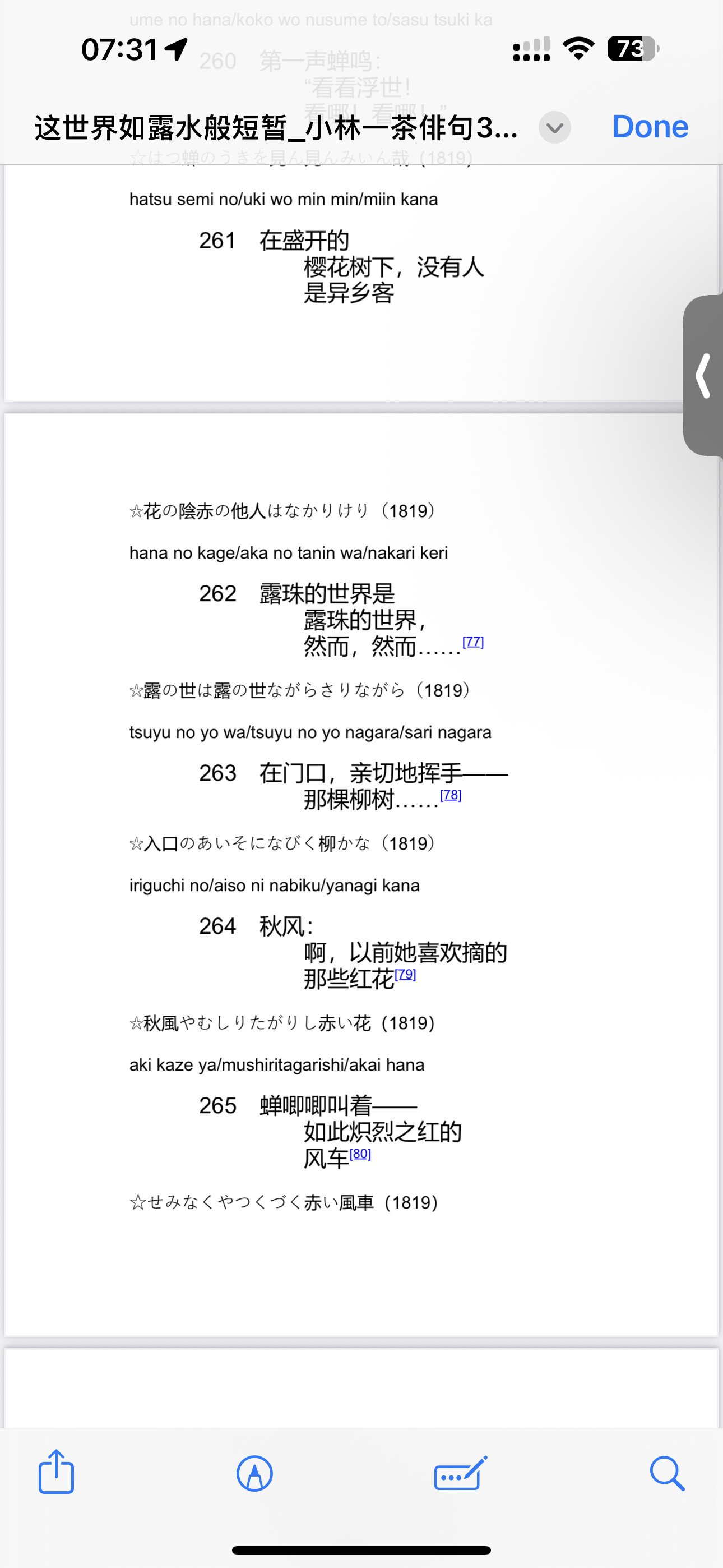 兩個翻譯版本的主體意象都抓得很準確,前兩句「我知道這世界 / 本如露水般短暫」忠實地傳達了俳句前半部分的核心思想——對生命短暫、世事無常的認知。