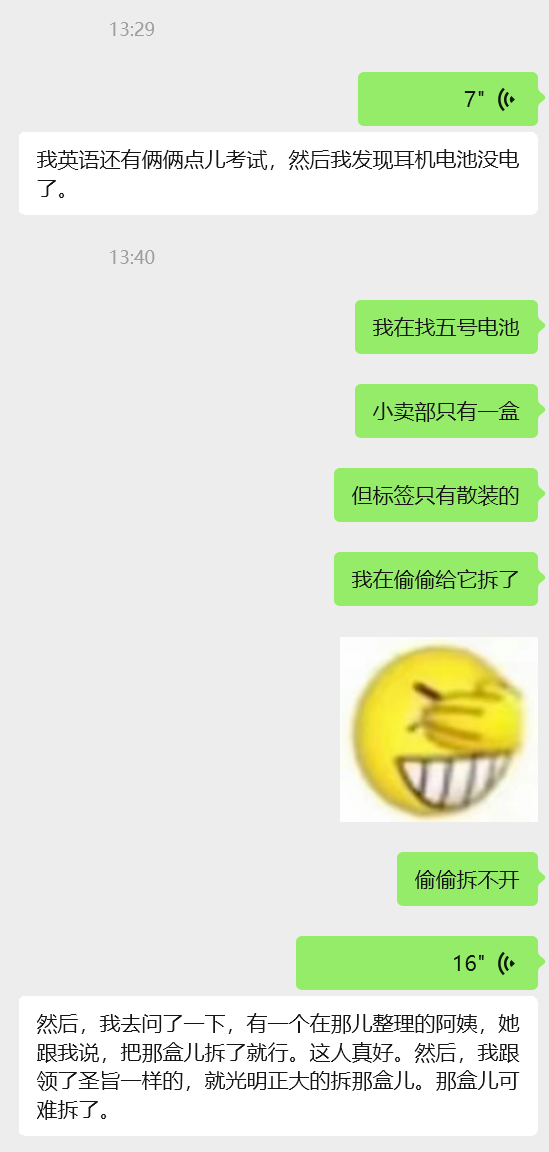 于是去了旁边的小卖部,问了店员电池在哪,说这种小东西一般在结账的地方。于是去结账的地方找,发现,散装的只有七号电池,五号电池只有一大盒的。而且五号只有南孚电池,没有别的品牌的,我问客服,只有南孚行不行,ta说,我们学校有的人用南孚电池可以,有的不行。我想,还有两个小时,我先买上南孚,回去试试,实在不行就美团买,反正半个小时之内肯定能到。