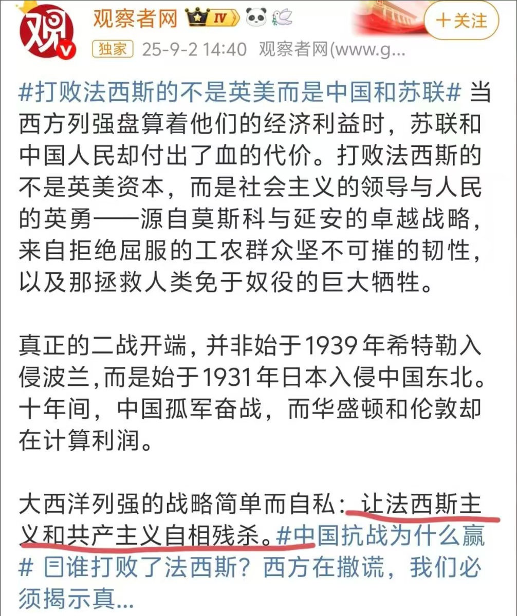 #打败法西斯的不是英美而是中国和苏联#当西方列强盘算着他们的经济利益时,苏联和中国人民却付出了血的代价。打败法西斯的不是英美资本,而是社会主义的领导与人民的英勇一一源自莫斯科与延安的卓越战略,来自拒绝屈服的工农群众坚不可摧的韧性,以及那拯救人类免于奴役的巨大牺牲。