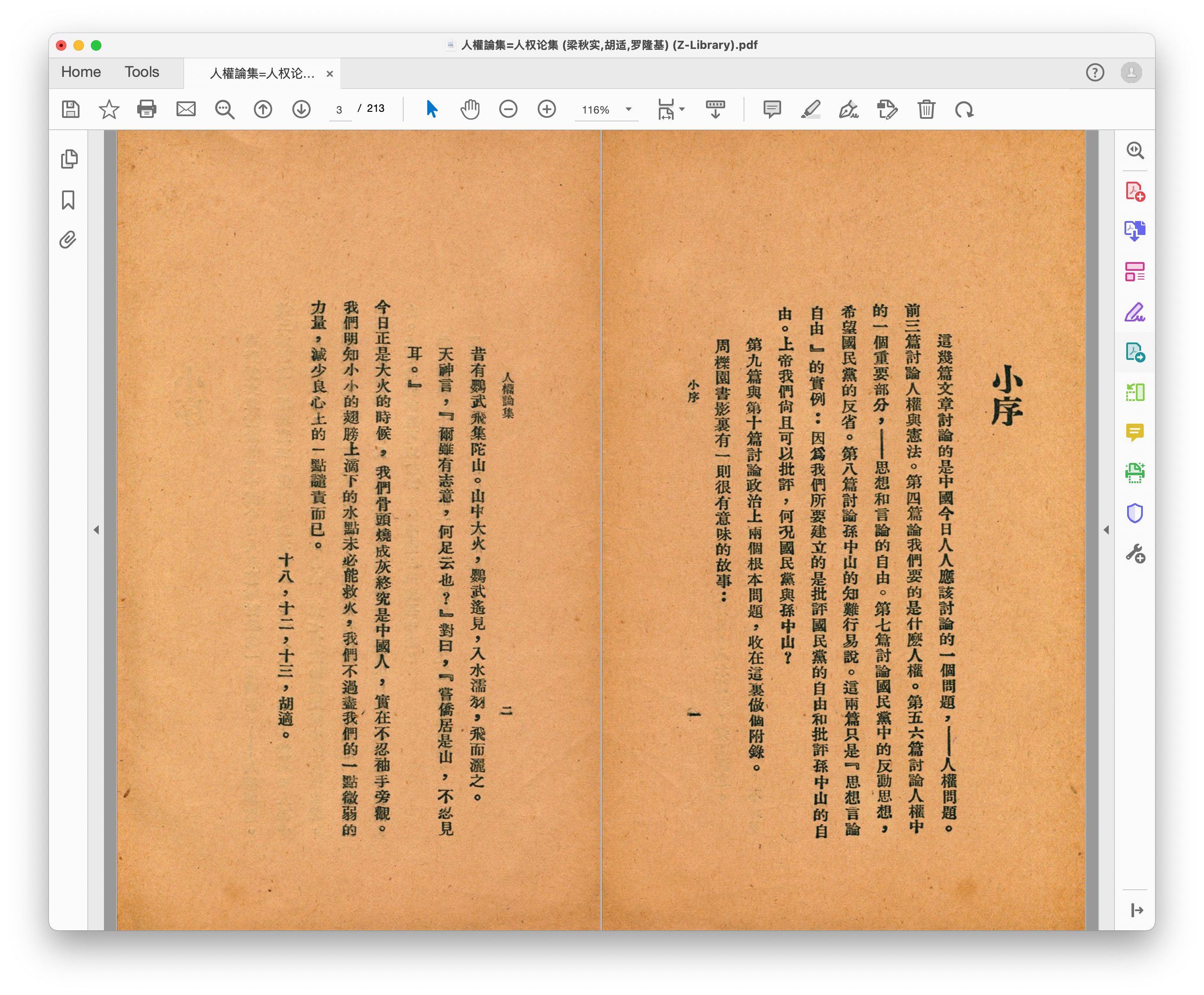 這幾篇文章討論的是中國今日人人應該討論的一個問題,—— 人權問題。前三篇討論人權與憲法。第四篇論我們要的是什麼人權。第五六篇討論人權中的一個重要部分,—— 思想和言論的自由。第七篇討論國民黨中的反動思想,希望國民黨的反省。第八篇討論孫中山的知易難行說。這兩篇只是『思想言論自由』的實例:因爲我們所要建立的是批評國民黨的自由和批評孫中山的自由。上帝我們尚且可以批評,何況國民黨與孫中山?