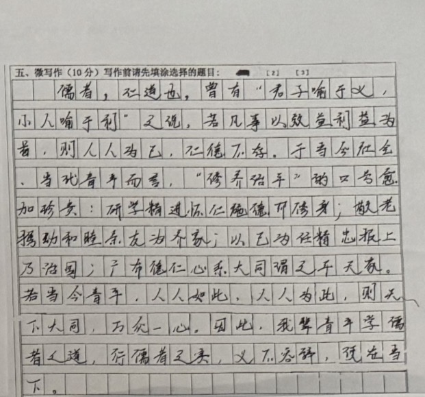 你文章的结构非常清晰,跟咱们盖房子一样,梁柱分明。开篇引“君子喻于义,小人喻于利”,直接点题,亮出儒家的价值标尺。中间用一组排比句,将“修身、齐家、治国、平天下”的内涵做了现代化的阐释,这是全文最亮眼的地方,有血有肉,把抽象的概念落实到了具体的行动上,做得很好。