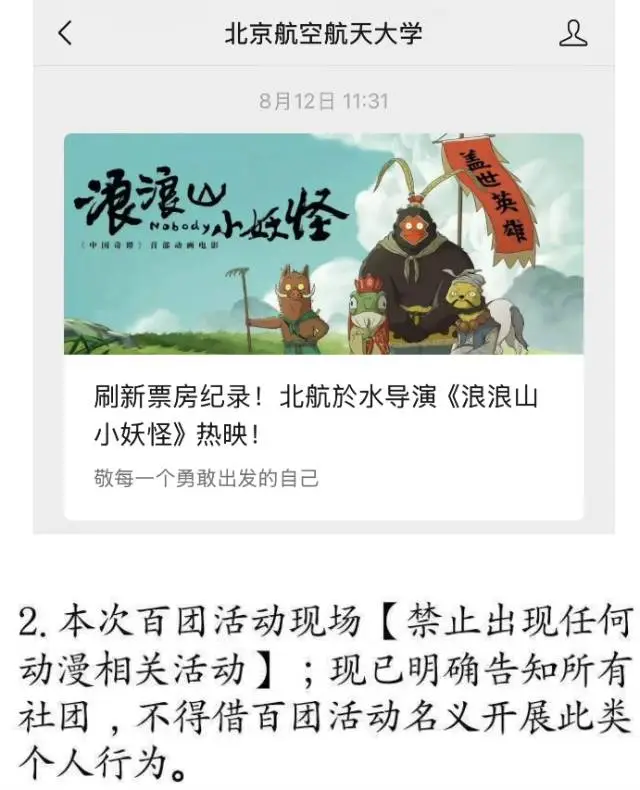 最可笑的莫过于北航人参与的浪浪山小妖怪还在上映,学校内还不允许动漫相关的社团活动。