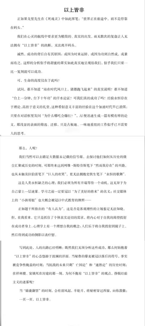 - 分级理由:文章以“以上皆非”为纲,批判成功学的机械套用,倡导个体精神自由,思想锐利,材料组织精妙,结构层层递进,语言富有文采。然立意稍显片面,未能辩证区分“分析成功”与“套用成功”,致论证深度不足,扣分主要源于此。整体仍属佳作,但未达圆满。