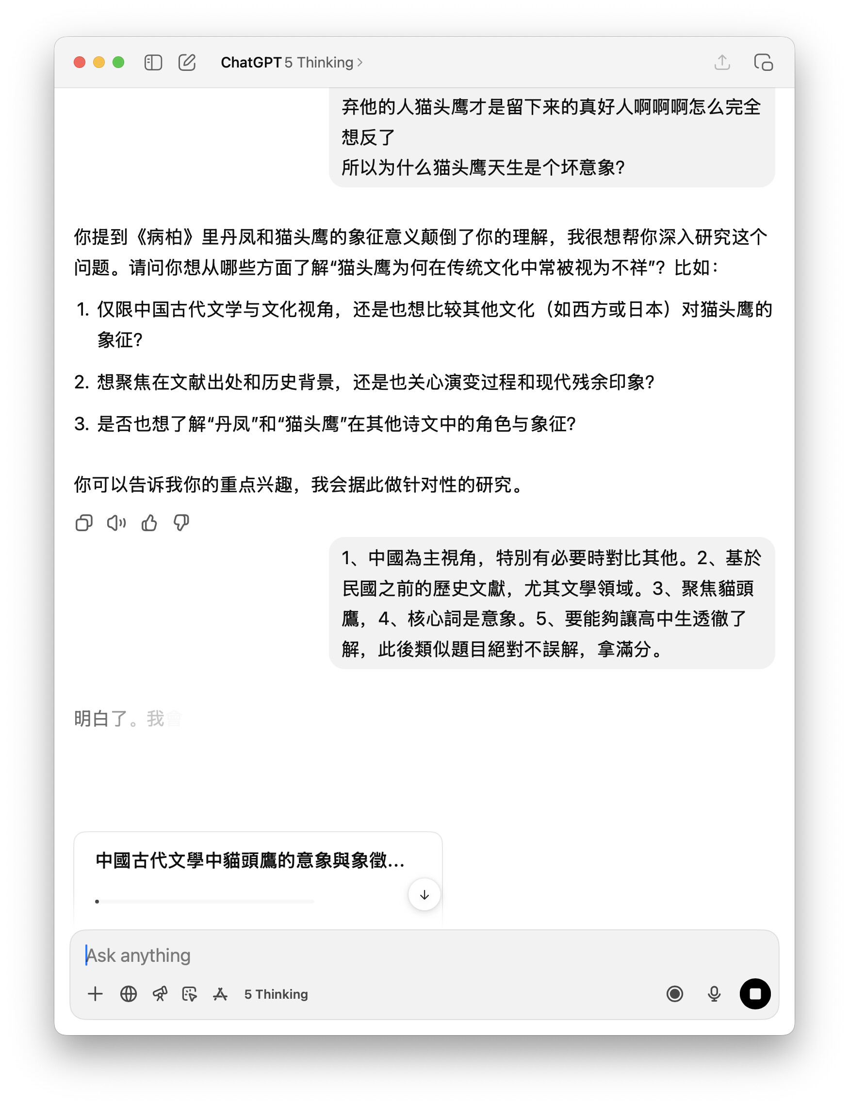 對於備考的高中生而言,在面對相關考題時,應力求超越「鸱鸮代表不祥,鳳凰代表吉祥」的淺層認知。更為深刻的分析應當闡述這些意象意義形成的原因與演變的過程。在作答時,可有效引用《詩經·鸱鸮》作為其負面形象的奠基之作,以賈誼《鵩鳥賦》為例說明其在哲學層面的複雜性,並援引李商隱等詩人的名句來論證其在後世文學中作為「小人」的政治隱喻。唯有如此,才能展現出對這一文化符號背後深厚的歷史、政治與哲學底蘊的透徹理解。