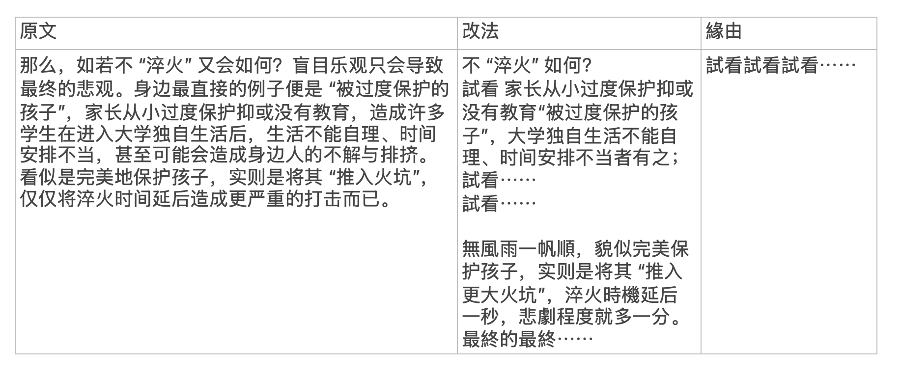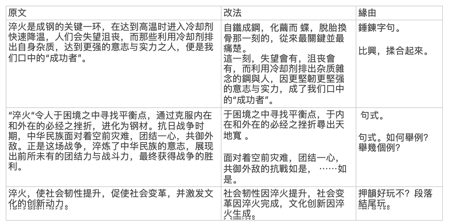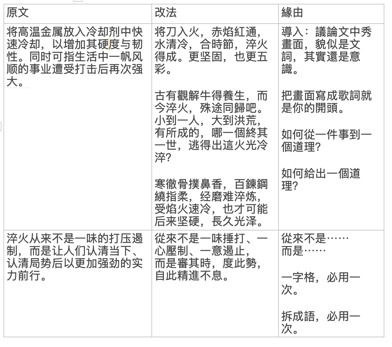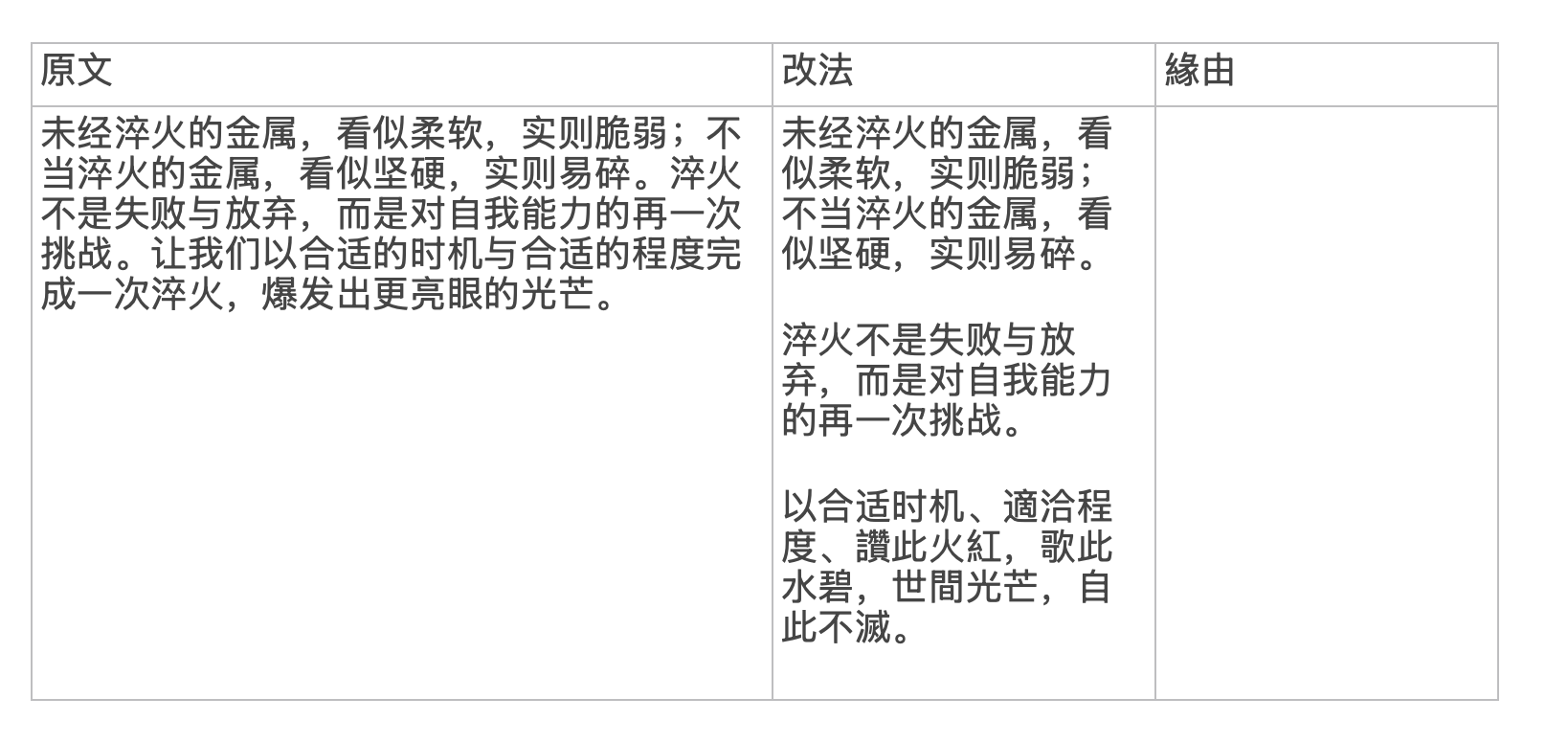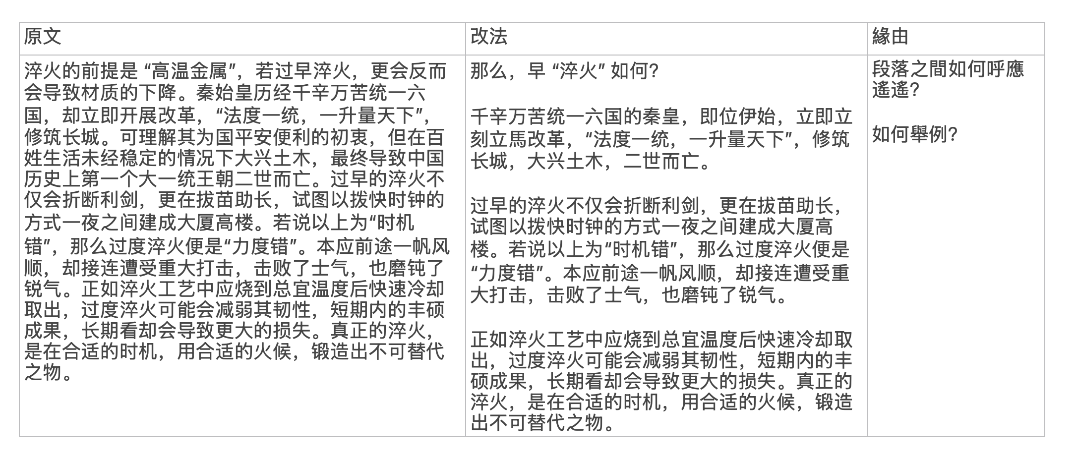 - 結構層次(7/10):首尾呼應,分段清晰,然段落間如「那麼,如若不『淬火』又會如何?」轉折突兀,似斧鑿之痕。可效法《孟子》論證的層遞之法,以內容推進替代過渡詞。