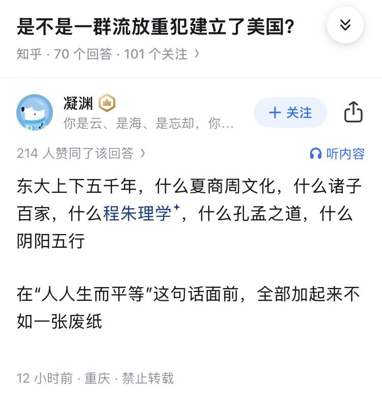 知乎用戶的論點將「人人生而平等」這一單一的現代政治理想,與數千年延續、包含哲學、倫理、制度、歷史的複雜文明體系(夏商周文化、諸子百家、孔孟之道等)進行了對比,並得出「全部加起來不如一張廢紙」的結論。