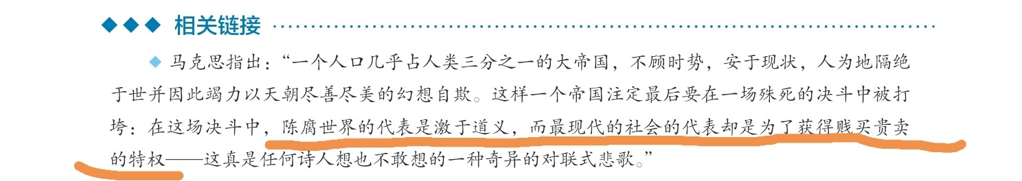 這段話精準地概括了近代中西文明衝突的悲劇性核心:一場以「道義」為名的衰敗文明,被一個以「購買販賣特權」(即資本主義擴張和殖民主義)為動機的現代文明所擊敗。