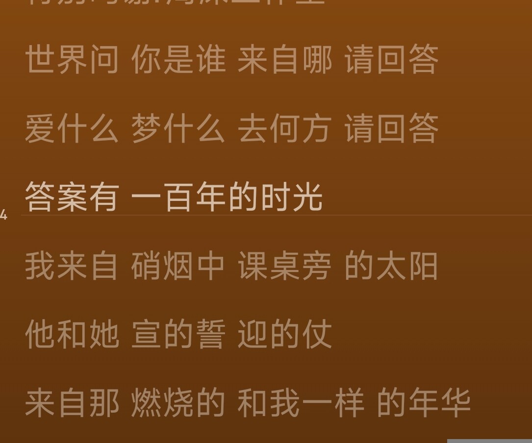 的时候脑中自动播放如下歌曲(《有我 (庆祝中国共青团成立100周年主题宣传片《共青春》主题曲)》: 有我(庆祝中国共青团成立100周年主题宣传片《共青春》主题曲) - 周深 - 单曲 - 网易云音乐 (来自@网易云音乐)