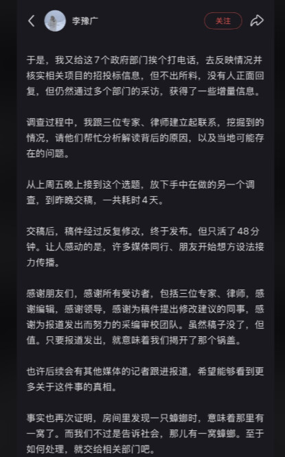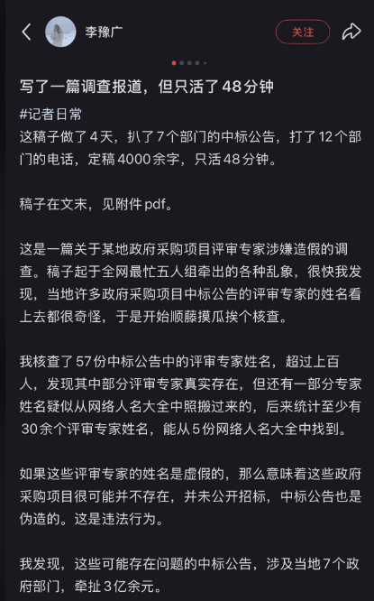 写了一篇调查报道,但只活了 48 分钟 这个稿子做了 4 天,扒了 7 个部门的中标公告,打了 12 个部门的电话,定稿 4000 余字,只活 48 分钟 。
