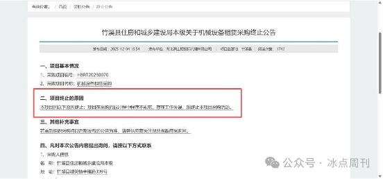 上述公告的发布单位湖北润土招投标代理有限公司(以下简称“润土公司”),是竹溪县住建局选择的采购代理机构。12 月 4 日下午,润土公司发布了该项目的采购终止公告,声称“项目在采购招标过程中程序不规范,存在工作失误”。