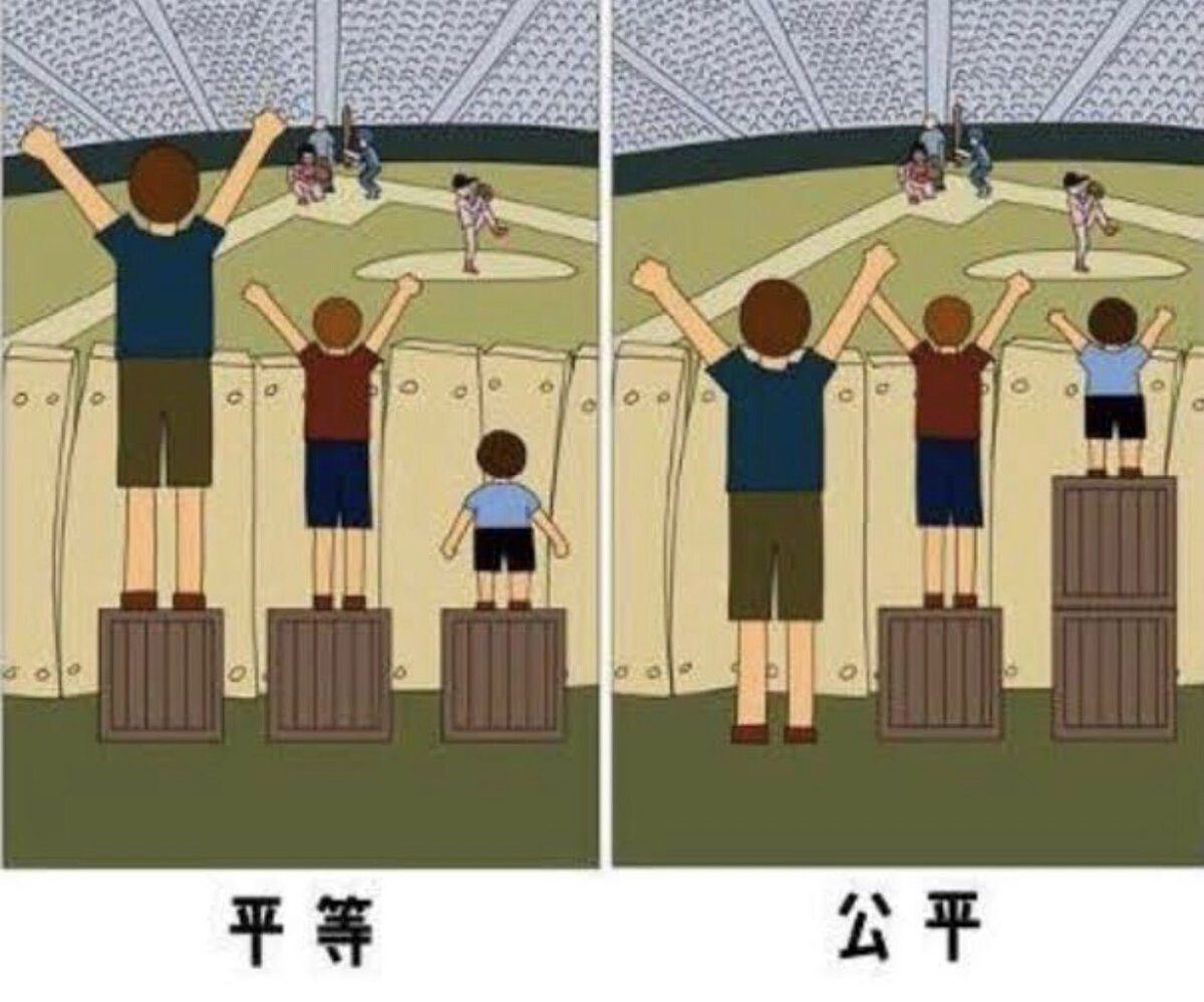 这个感觉就是有点像法学上的强式平等和弱式平等的概念,一个是同等对待,一个是不同情况差别对待,都是平等,但是强式平等可能不一定能完全达到公平