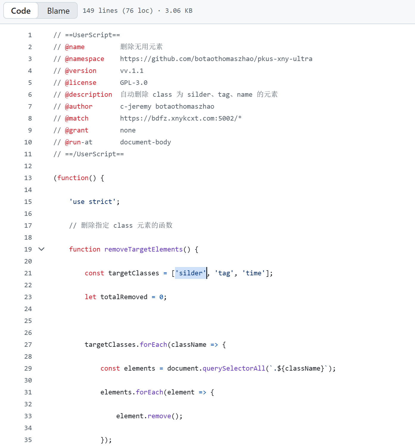 Clean up the userscript header by removing any `@grant` permissions for the now-unused `GM_*` functions.