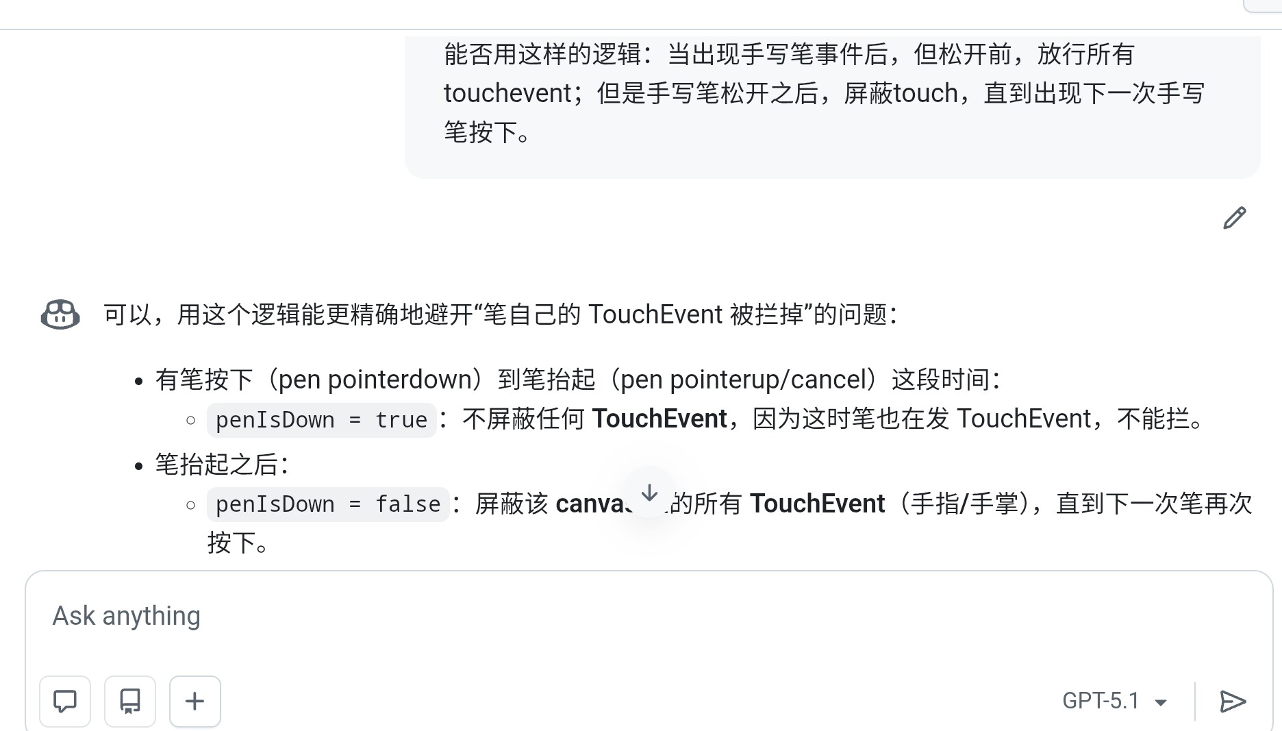 - 一旦某次检测到手写笔 pointerdown 发生:从那一刻起及之后,所有触摸(手指)都屏蔽,只保留手写笔绘制(包括手写笔抬起之后,手指依然禁止,直到将来某个“重置”,暂时不做)。